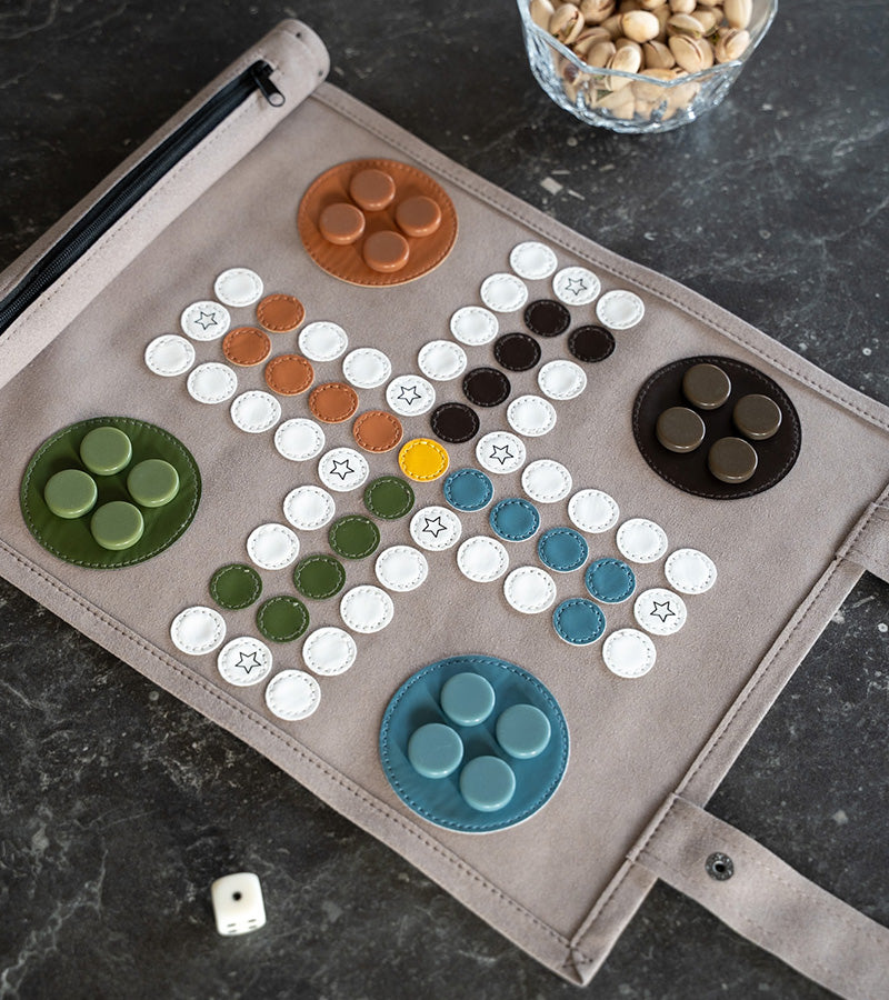 Alle terninger og brikker opbevares sikkert i lynlåslommen.